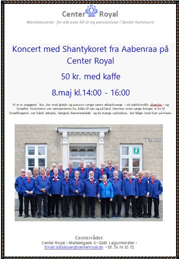 | Underholdning med Aabenraa Shantykor Med kaffe og kage pris.50kr. |